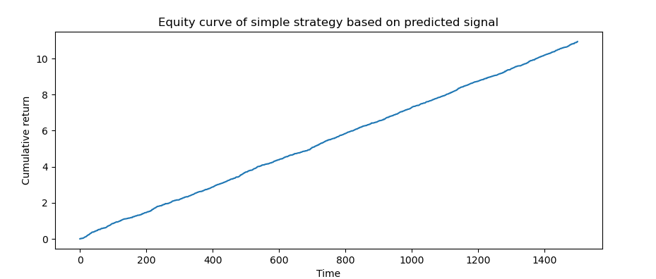 Because the data is drawn from a normal distribution, the model is essentially estimating the conditional mean of future returns. There is no real structure or predictable pattern beyond the small signal injected. By creating a small back test using the predicted return as a signal, we get a equity curve like this: