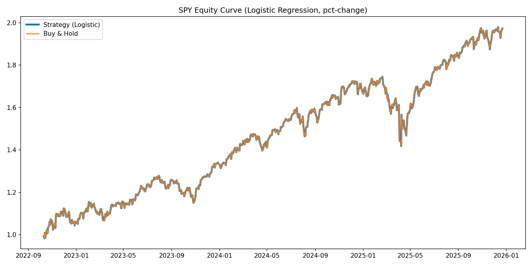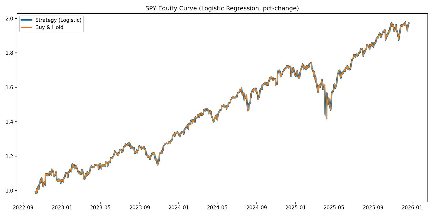 A similar effect can be seen if a similar test is run using logistic regression (a linear classifier) to predict whether or not the next close in SPY will be positive. The model will only predict an up signal because on average the SPY goes up.